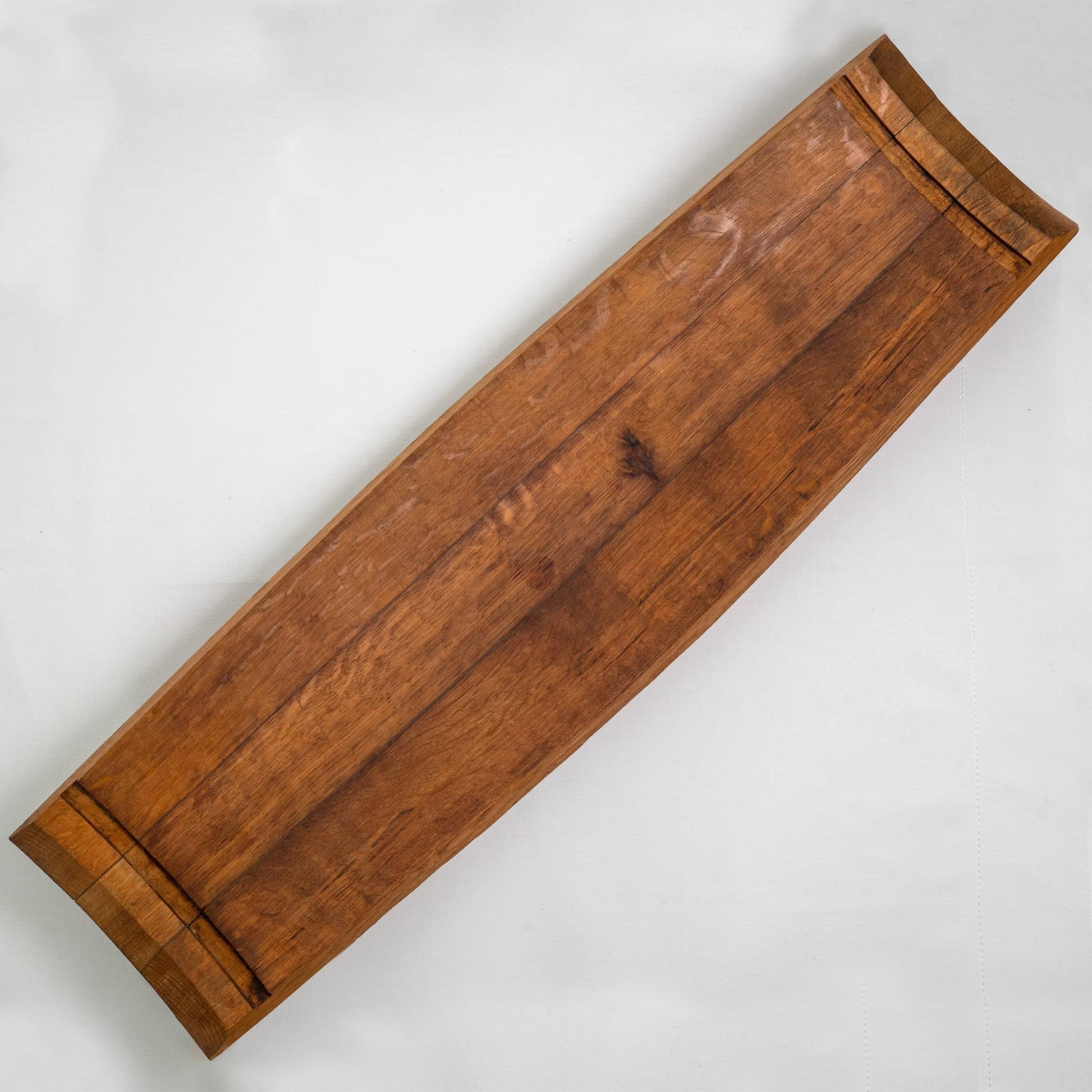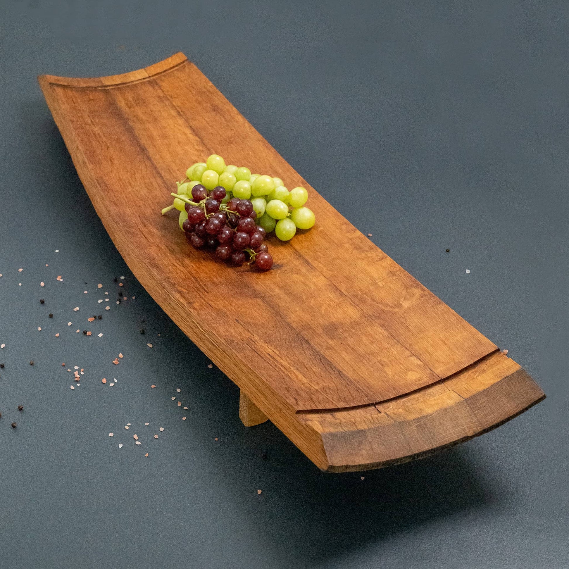 Unique, rustic, and handmade wooden platter made from oak wine barrels. The perfect long platter or fruit bowl to serve cheeses, fruit, breads and more.
